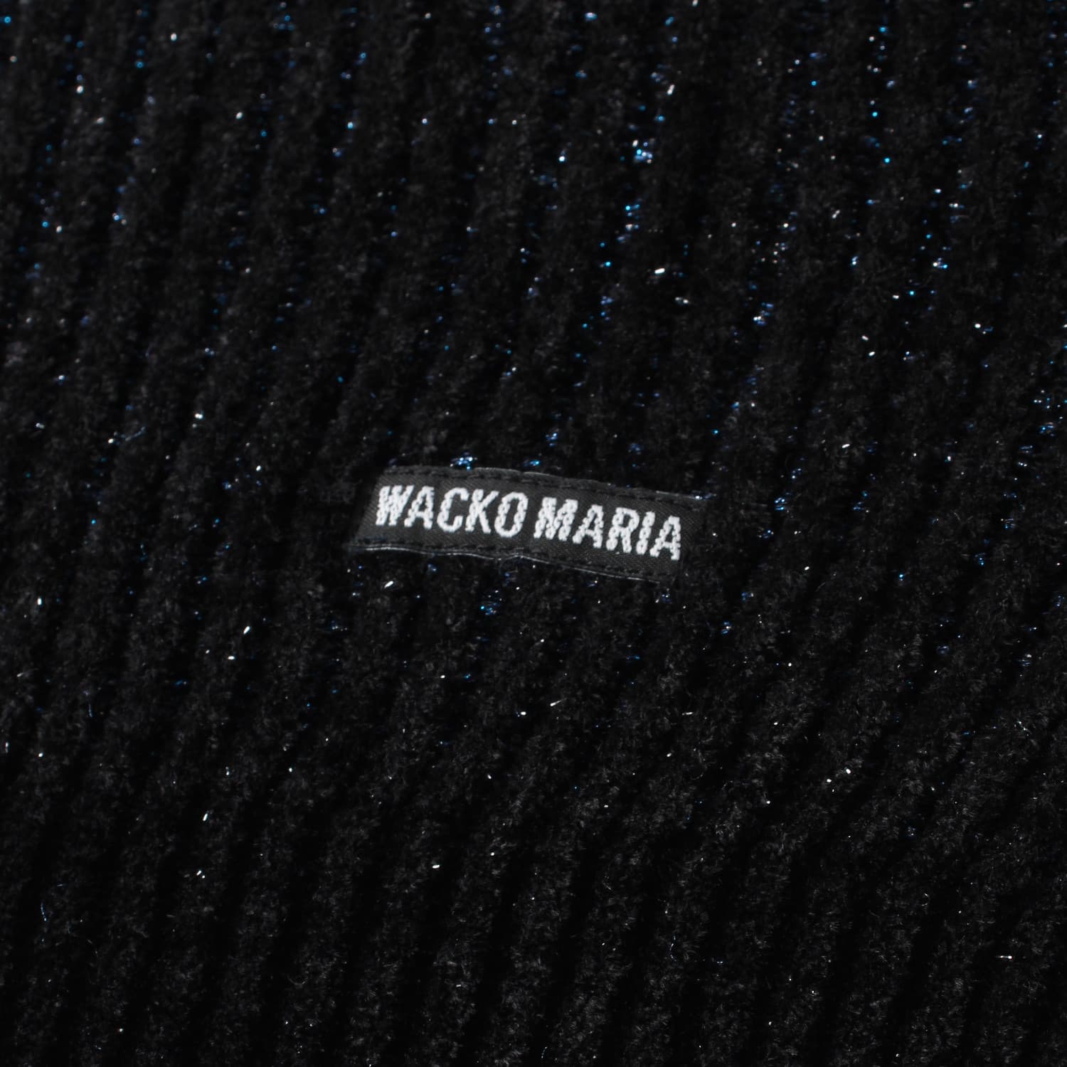 From WACKO MARIA's 2025 Fall/Winter collection "Heaven Tokyo," we have received the GLITTER KNIT SWEATER 25FW-WMK-KN03 , a sweater with a black base and blue glitter woven in stripes.